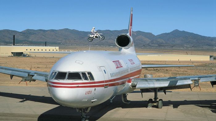 Reaching a speed of 73 mph before launching off of a 120 ft ramp stuntman Doug Dancer successfully cleared the 160ft wingspan of this passenger jet.